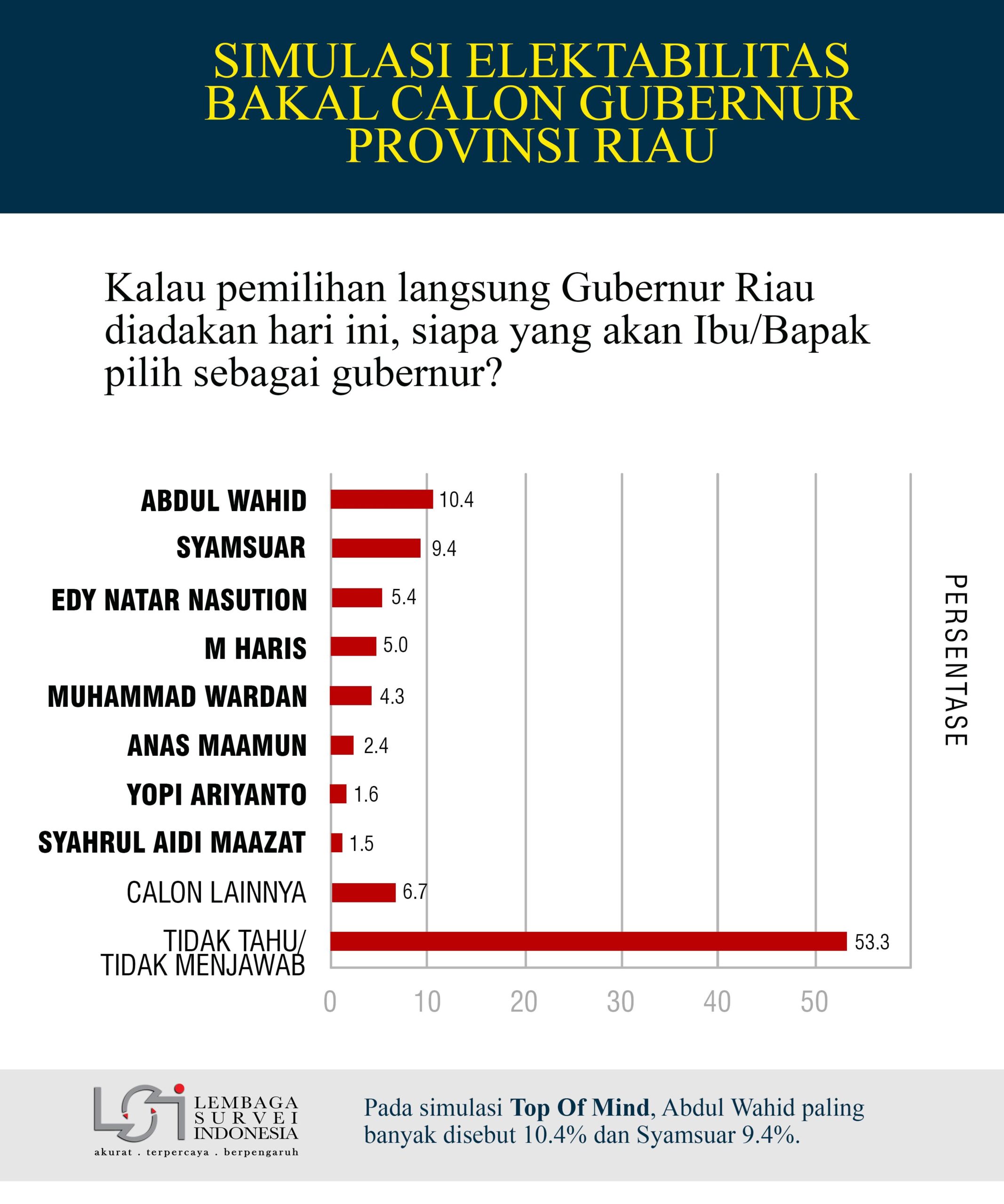 Abdul Wahid berhasil menduduki puncak elektabilitas tertinggi dibanding nama-nama beken lainnya seperti Mantan Gubernur Riau , Syamsuar dan Edi Natar Nasution.