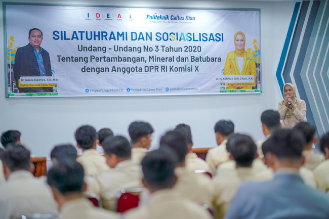 PEKANBARU, TNN – Anggota Komisi X DPR RI, Dr Hj Karmila Sari, SKom, MM, memberikan sosialisasi mengenai Undang-Undang Nomor 3 Tahun 2020 tentang Pertambangan Mineral dan Batubara (Minerba) kepada mahasiswa Politeknik Caltex Riau (PCR) pada Senin (24/03/2025) di Aula. Sosialisasi ini bertujuan untuk memberikan pemahaman yang lebih baik tentang sektor pertambangan dan peluang yang terbuka di dalamnya, khususnya bagi perguruan tinggi.