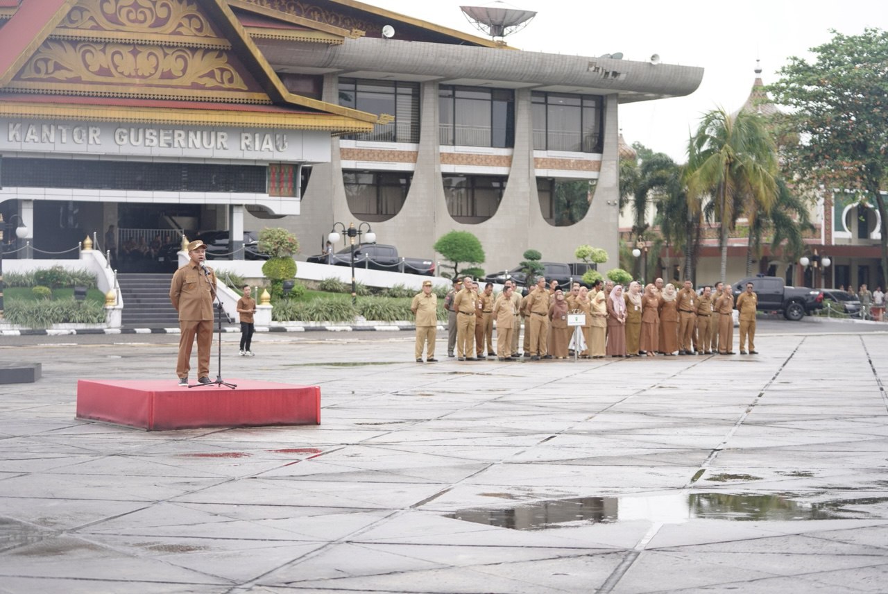 PEKANBARU – Memulai hari pertama kerja usai libur Idulfitri 1446 Hijriah, Gubernur Riau (Gubri) Abdul Wahid menegaskan pentingnya kedisiplinan dan integritas seluruh aparatur sipil negara (ASN) maupun tenaga non ASN di lingkungan Pemerintah Provinsi (Pemprov) Riau. Hal itu disampaikannya saat memimpin apel pagi sekaligus halal bihalal bersama jajaran pegawai, di halaman Kantor Gubernur Riau, Senin (8/4/2025).