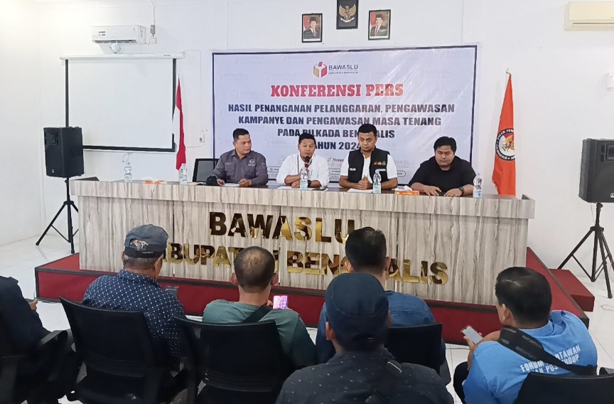 BENGKALIS, TNN – Badan Pengawas Pemilu (Bawaslu) Kabupaten Bengkalis, Senin (25/11) menggelar konferensi pers dalam rangka ekspose penanganan pelanggaran selama tahapan kampanye Pilkada Serentak Tahun 2024. Selain itu, sejumlah hasil pengawasan yang dilakukan juga turut disampaikan, seperti pengawasan di masa tenang.