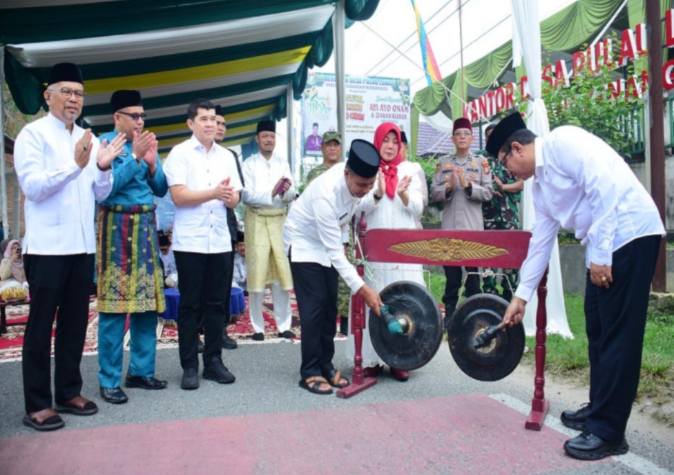 KAMPAR, TNN – Bupati Ahmad Yuzar didampingi Kajari Kampar Dwianto Prihartono, SH, MH memukul Oguong sebagai tanda dibukanya Festival Lomang Ayo Onam yang dipusatkan di Desa Pulau Lawas Kecamatan Bangkinang, Jumat (27/3/2026) pagi.