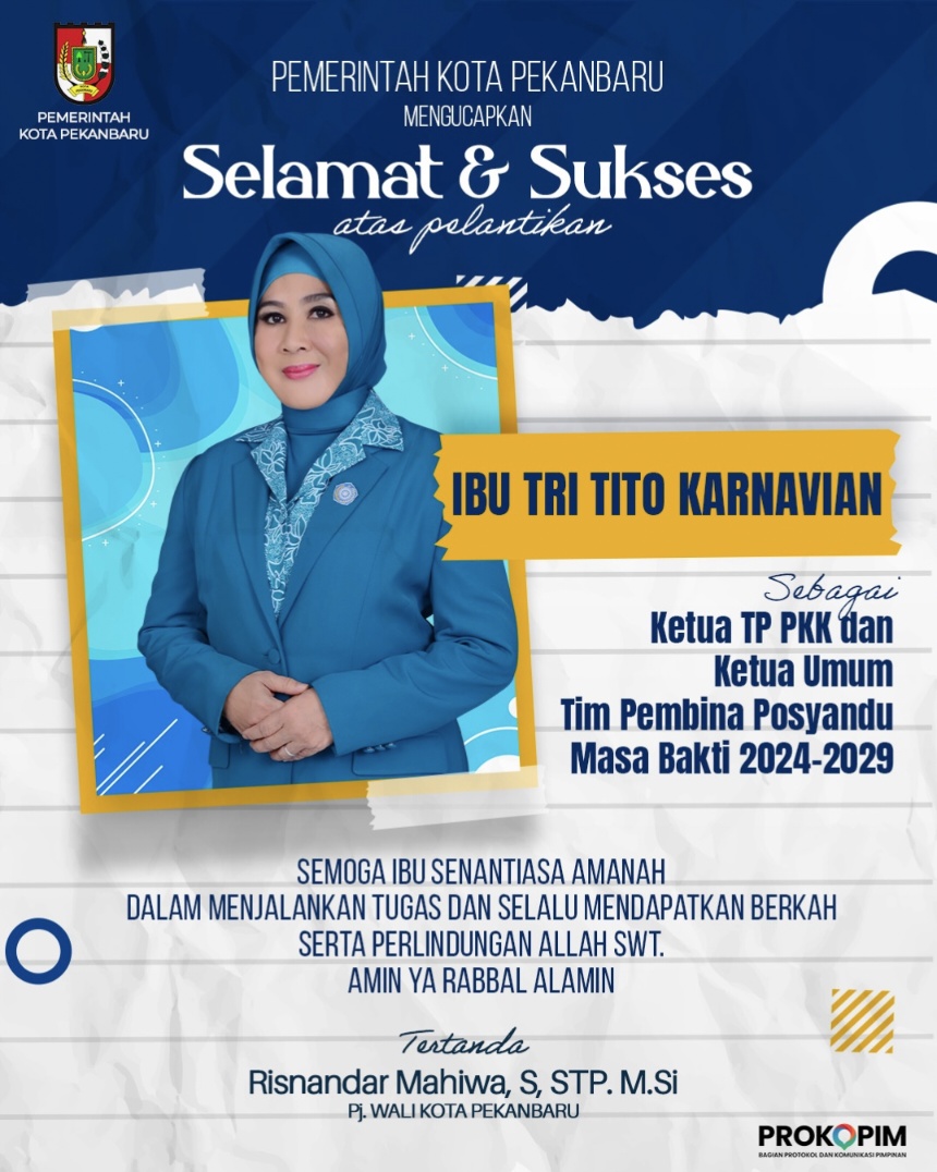 Pj Walikota Pekanbaru, Risnandar Mahiwa mengucapkan selamat atas pelantikan Tri Tito Karnavian sebagai Ketua Umum (Ketum) TP PKK dan Ketum Tim Pembina Pos Pelayanan Terpadu masa jabatan 2024-2029.