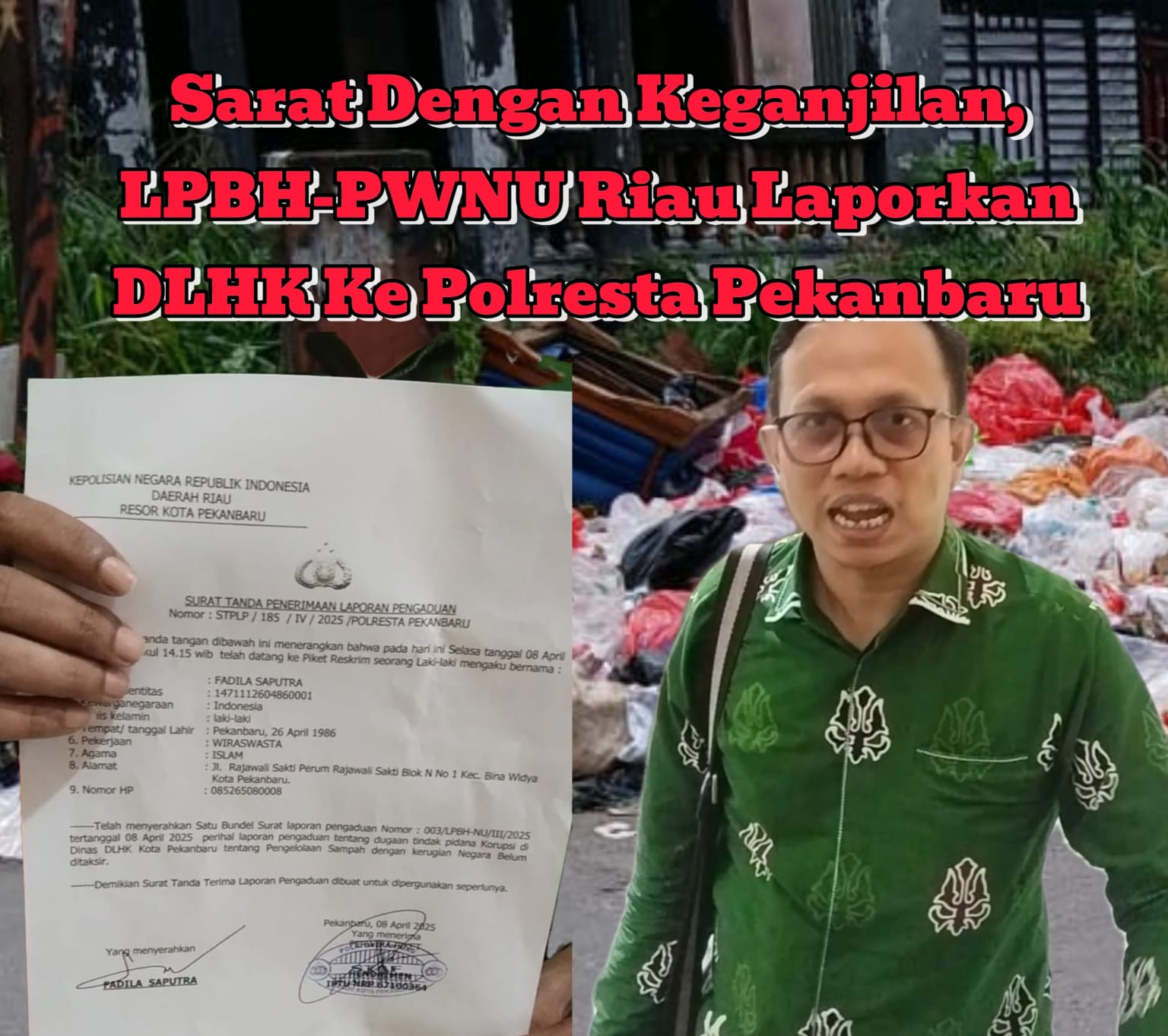 PEKANBARU, TNN – Lembaga Penyuluhan dan Bantuan Hukum Pengurus Wilayah Nahdlatul Ulama (LPBH-PWNU) Provinsi Riau resmi melaporkan dugaan tindak pidana korupsi pada pengadaan jasa angkutan sampah pada dinas Lingkungan Hidup dan Kebersihan kota Pekanbaru tahun anggaran 2025 ke polresta Pekanbaru, Selasa 8 April 2025.