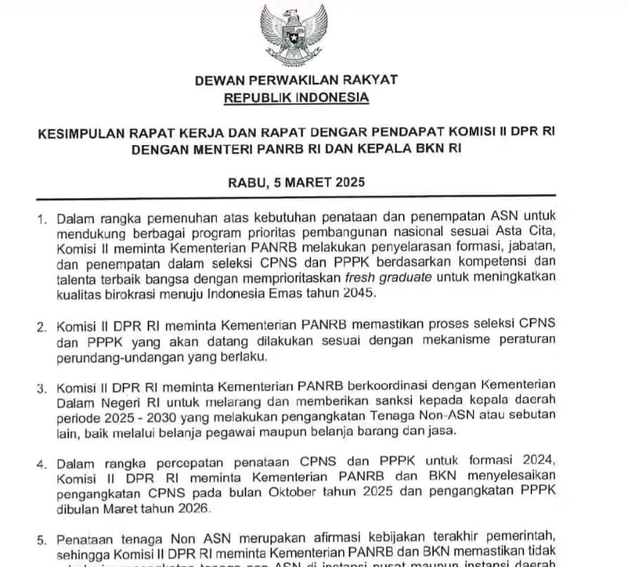 “Komisi II DPR RI meminta Kementerian PANRB berkoordinasi dengan Kementerian Dalam Negeri untuk melarang dan memberikan sanksi kepada kepala daerah periode 2025-2030 melakukan pengangkatan Tenaga Non ASN atau sebutan lain baik melalui belanja pegawai atau belanja barang dan jasa,” ujar Bahtra dalam Raker Komisi II dengan Kementerian PAN-RB, dan BKN dikutip Kamis (6/3/2025).