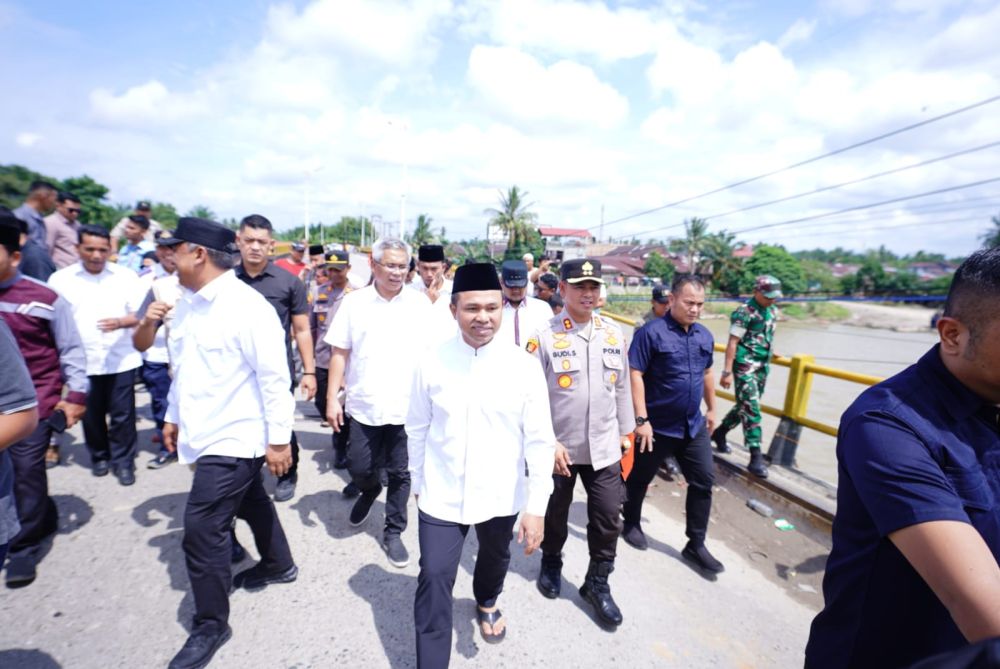 Rohul – Gubernur Riau (Gubri) Abdul Wahid meninjau kondisi Jembatan Sungai Rokan di Desa Sukadamai, Kecamatan Ujung Batu, Kabupaten Rokan Hulu (Rohul), pada Minggu (9/3/2025). Kunjungan ini dilakukan untuk melihat langsung dampak pergeseran struktur jembatan akibat arus sungai yang deras.