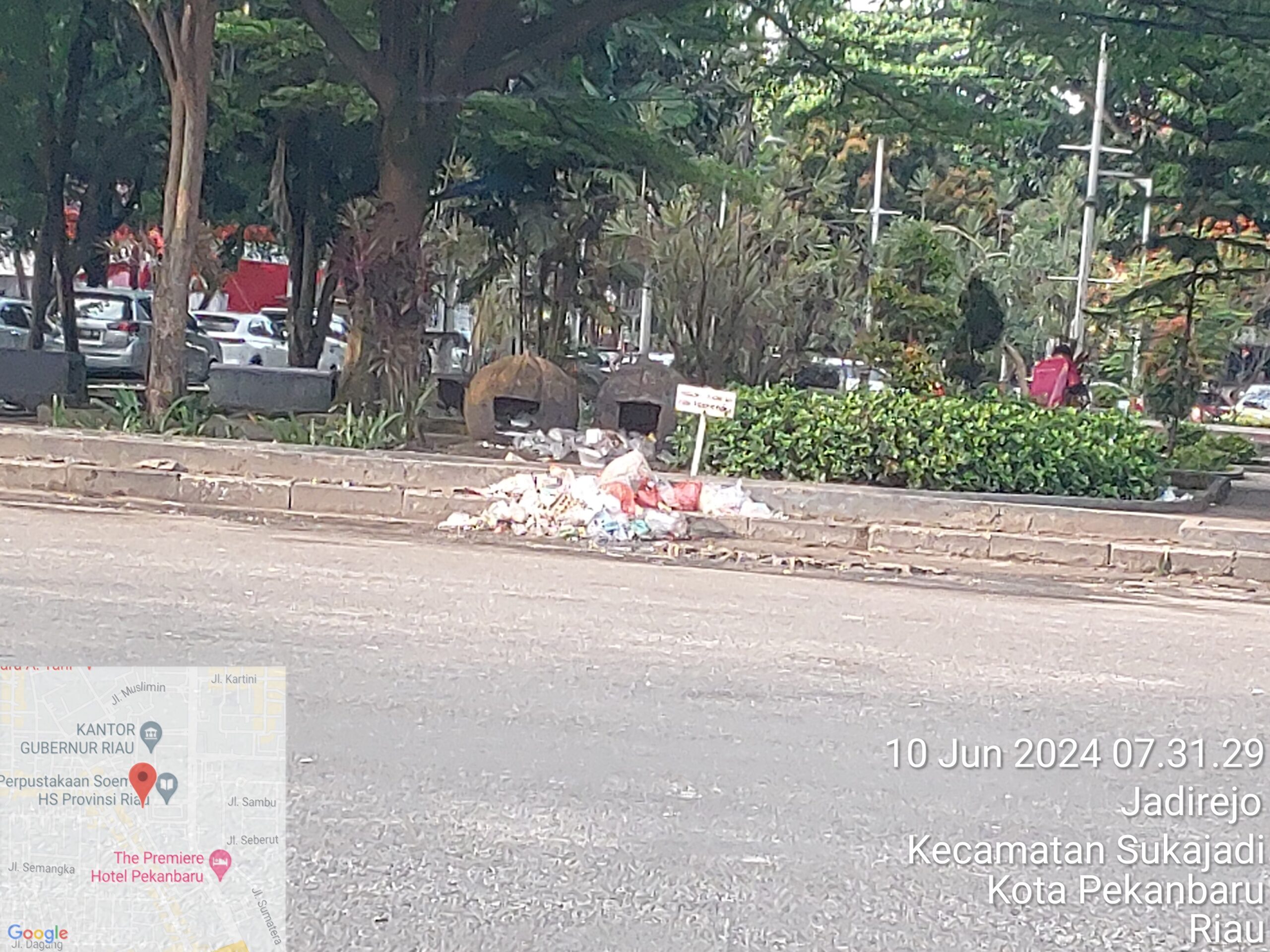 Pekanbaru – Pemandangan tak sedap terlihat di sekitar kantor Gubernur Riau , khususnya di Taman Kota sekitar jalan Cut Nyak Dien Kota Pekanbaru. Sampah-sampah plastik dan bekas makanan tampak berserakan belum diangkut hingga membuat sekitar Kantor Gubernur menjadi jorok sejak pagi, Senin (10/ 6).
