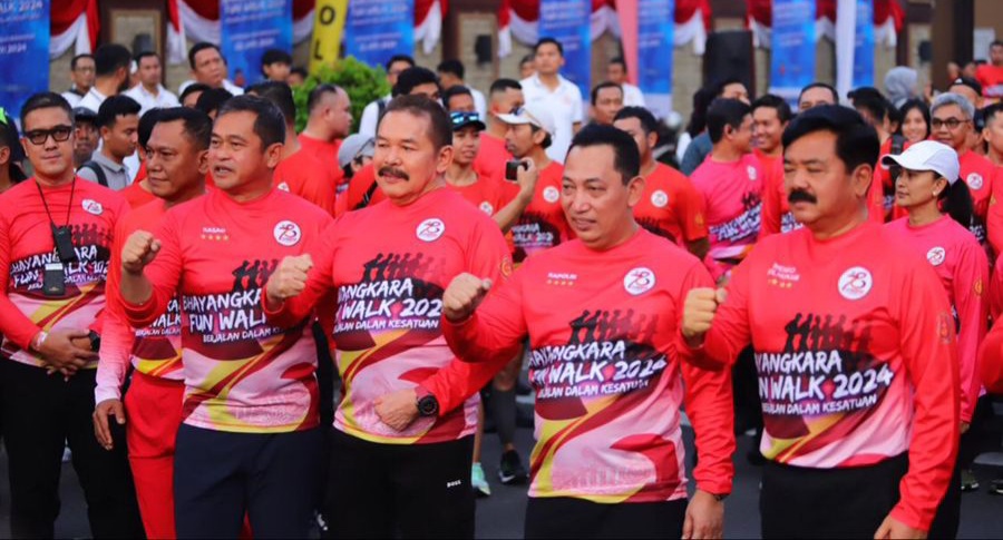 Jakarta – Kepala Kepolisian Negara Republik Indonesia (Kapolri) Jenderal Polisi Listyo Sigit Prabowo bersama dengan Jaksa Agung ST Burhanuddin, Menteri Koordinator Bidang Politik, Hukum, dan Keamanan (Menkopolhukam) Marsekal TNI (Purn.) Hadi Tjahjanto, dan Kepala Staf Angkatan Darat (KSAD) Jenderal TNI Maruli Simanjuntak membuka acara Bhayangkara Fun Walk 2024 yang bertajuk “Berjalan Dalam Kesatuan”. Kegiatan ini dilaksanakan pada sabtu 22 Juni 2024 bertempat di Lapangan Bhayangkara Markas Besar Kepolisian Negara Republik Indonesia (Mabes Polri), Jakarta.