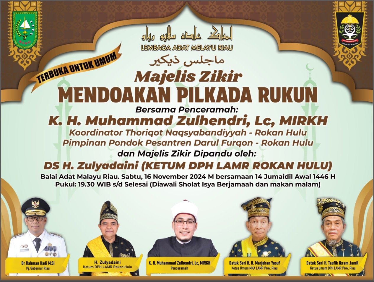 “Bismillahirrahmanirrahim, Assalamualaikum wa rahmatullahi wa barakaatuh. Lembaga Adat Melayu Riau, Provinsi Riau, dengan takzim menjemput Datuk Seri, datuk, Datin, Puan, Tuan, Encik dan Cik untuk menghadiri acara Majelis Dzikir mendoakan pilkada rukun pada Sabtu 16 November 2024,” Ketua Umum Majelis Kerapatan Adat LAMR, Datuk Seri Raja Marjohan Yusuf.