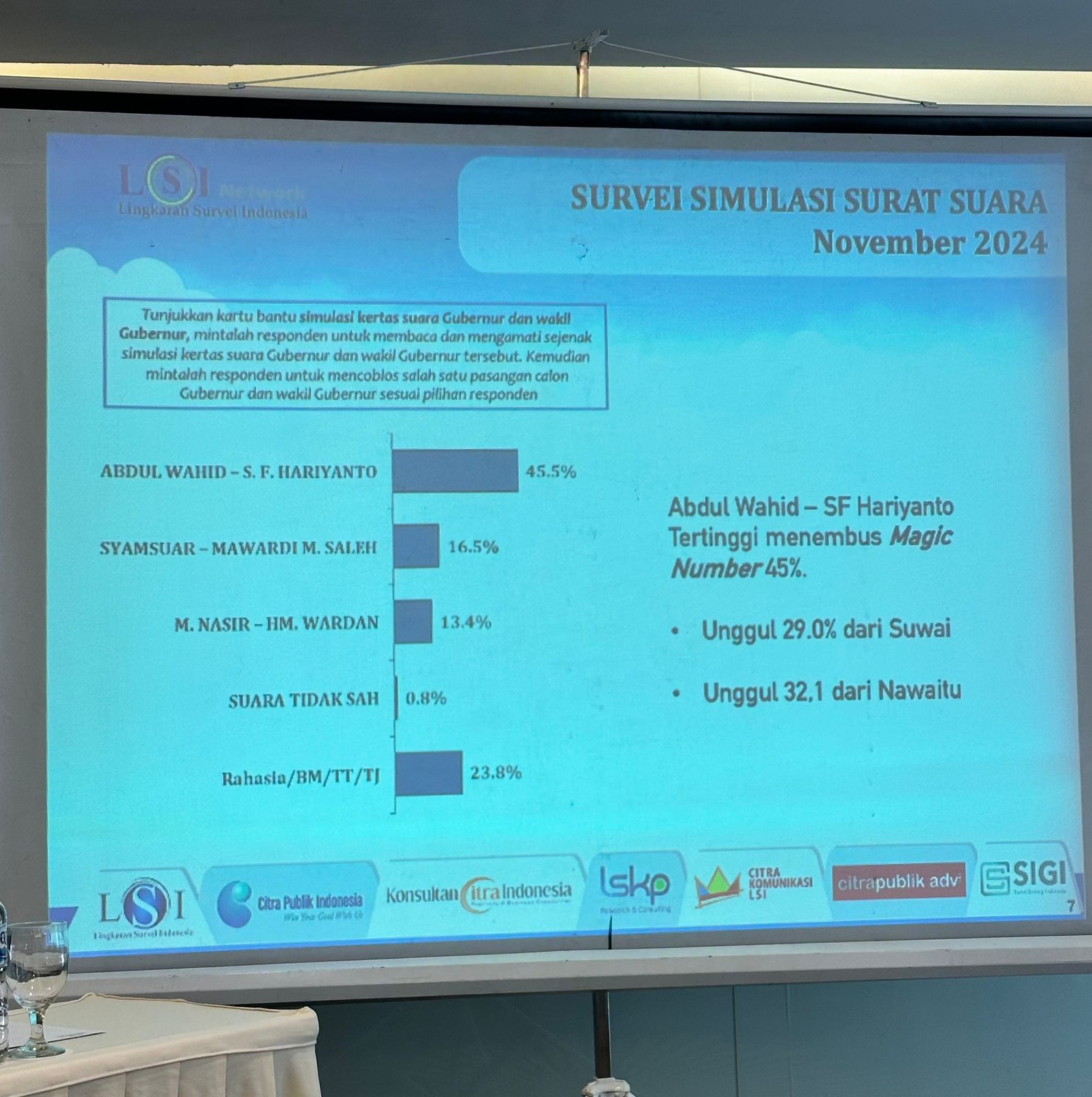 “Hasil terbaru LSI terbaru terhadap Pilgub Riau, elektabilitas pasangan Abdul Wahid-SF Hariyanto tertinggi diangka 45,5 persen. Untuk ukuran pemilihan gubernur angka 45 persen itu sudah bisa memenangkan pemilihan,” kata Direktur SIGI LSI Denny JA, Ardian Sopa.