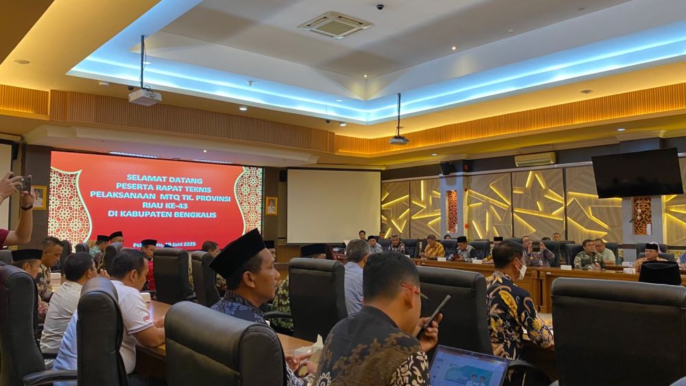 PEKANBARU, TNN – Pemerintah Provinsi (Pemprov) Riau menggelar rapat teknis pelaksanaan MTQ tingkat Provinsi ke-43 Tahun 2025, di Ruang Rapat Melati Kantor Gubernur Riau, Kamis (19/6/2025). Rapat tersebut dipimpin langsung oleh Asisten I Setdaprov Riau Zulkifli Syukur, didampingi Sekretaris Daerah Kabupaten Bengkalis Ersan Saputra, Asisten I Kabupaten Bengkalis, Andris Wasono, dan tamu undangan lainnya.