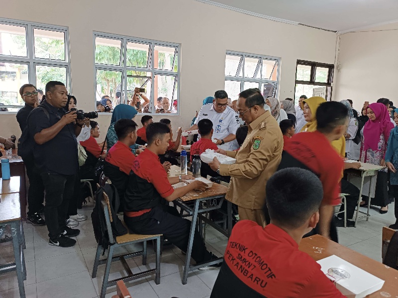 “Hari ini kita melakukan peninjauan simulasi progam makan siang bergizi gratis di dua sekolah yakni SMAN 16 dan SMK Negeri 7 Pekanbaru, untuk melihat kebutuhan makan anak-anak seusia siswa SMA dan SMK, yang pastinya berbeda dengan anak TK, SD dan SMP,” kata Pj Gubri.