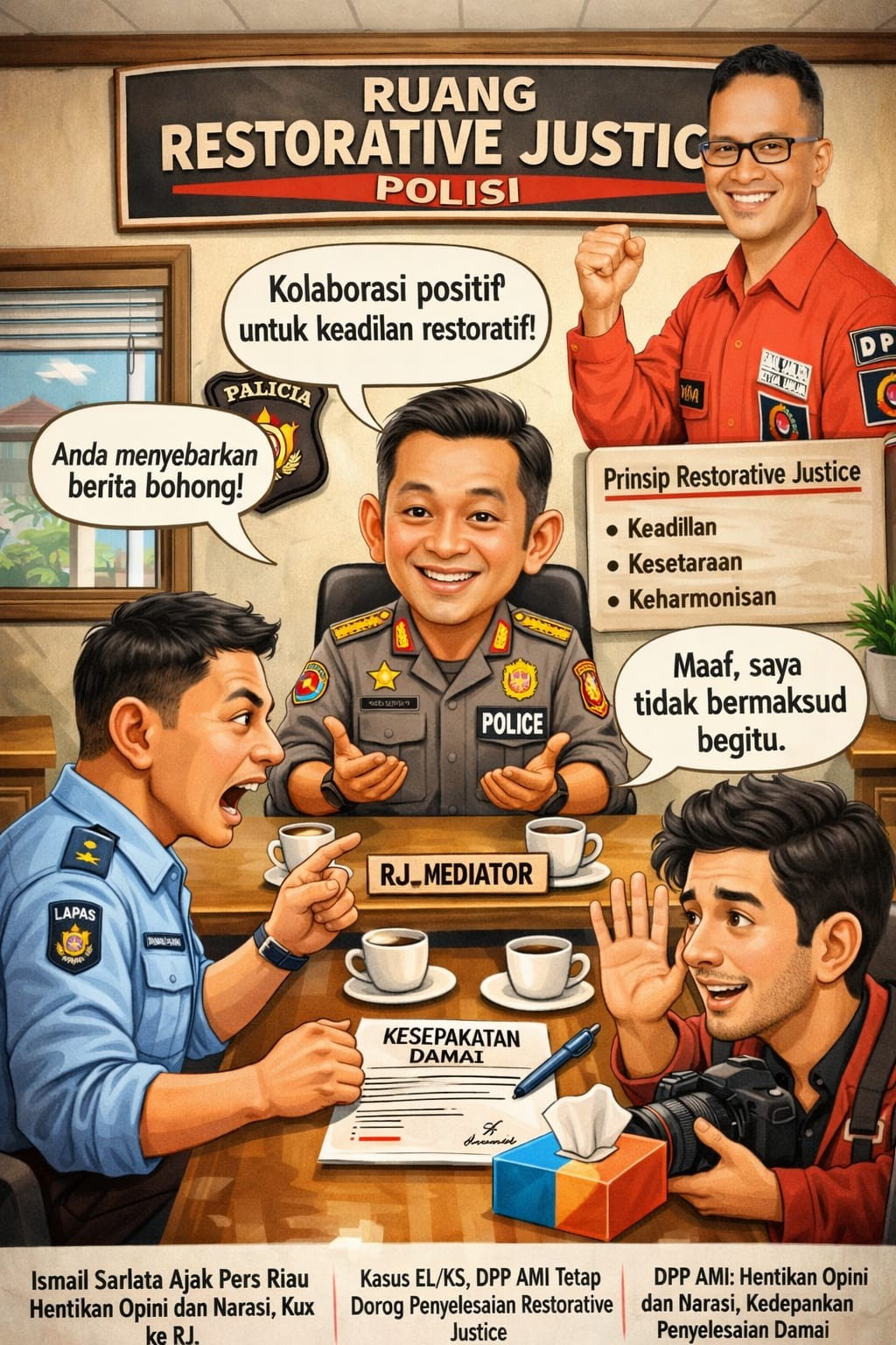 PEKANBARU, TNN — Ketua Umum Dewan Pimpinan Pusat Aliansi Media Indonesia (DPP AMI), Ismail Sarlata, mengajak seluruh insan pers di Riau untuk menahan diri dan menghentikan penyebaran opini maupun narasi yang berpotensi memperkeruh situasi terkait perkara yang melibatkan pihak Lembaga Pemasyarakatan (Lapas) Kelas IIA Pekanbaru dan rekan pers berinisial EL/KS.