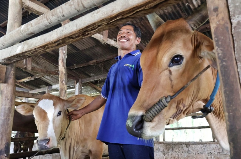 Keterangan foto: Sudarman selaku Ketua Kelompok Tani Bhina Mukti Sari saat menunjukan sapi-sapi yang dipelihara untuk kebutuhan keberlanjutan dalam program Desa Energi Berdikari (DEB) Muktisari, di Kabupaten Kampar, Provinsi Riau.***