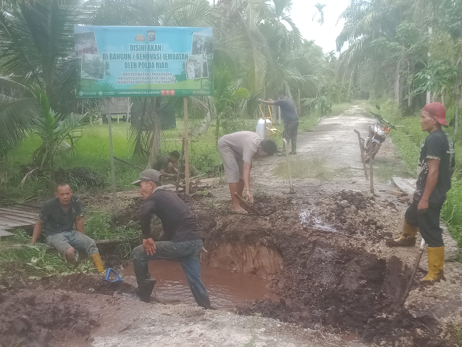 Usai doa bersama, pembangunan dilanjutkan dengan pembongkaran jembatan lama dan pembersihan area kerja. Proses ini melibatkan empat personel Polsek Rangsang Barat dan enam warga.