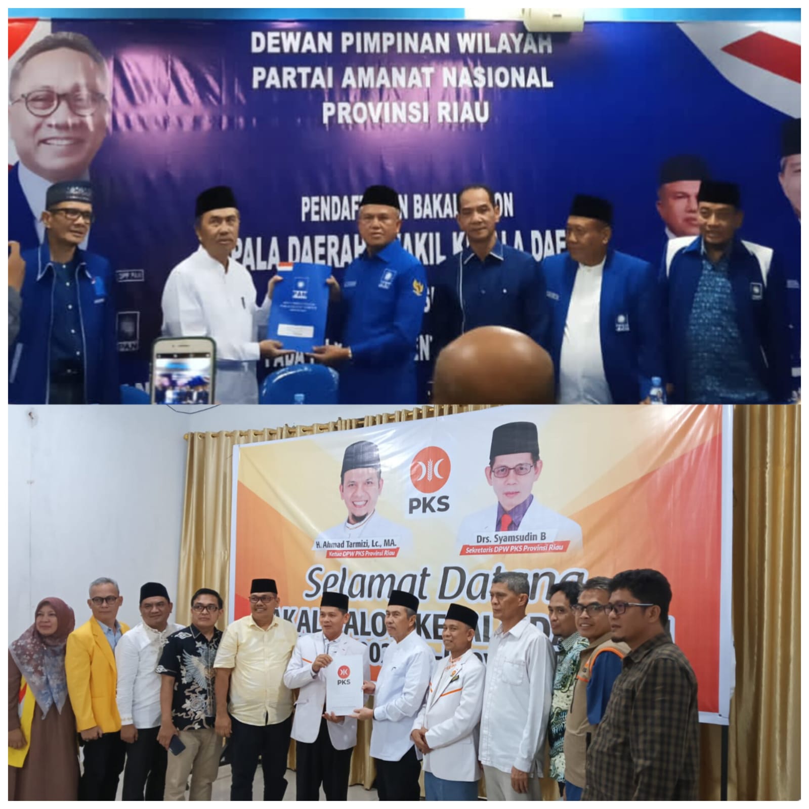PEKANBARU | Ketua DPD I Golkar Riau, Syamsuar secara resmi mengembalikan formulir pendaftaran bakal calon Gubernur Riau ke DPW PAN Riau dan DPW PKS Riau, Jumat (17/5/2024). Syamsuar datang bersama para pengurus DPD I Golkar serta para relawan pendukung Syamsuar. Setibanya di kantor DPW PAN Riau rombongan disambut oleh Sekretaris DPW PAN Riau Sahidin dan Tim Desk Pilkada DPW PAN Riau.