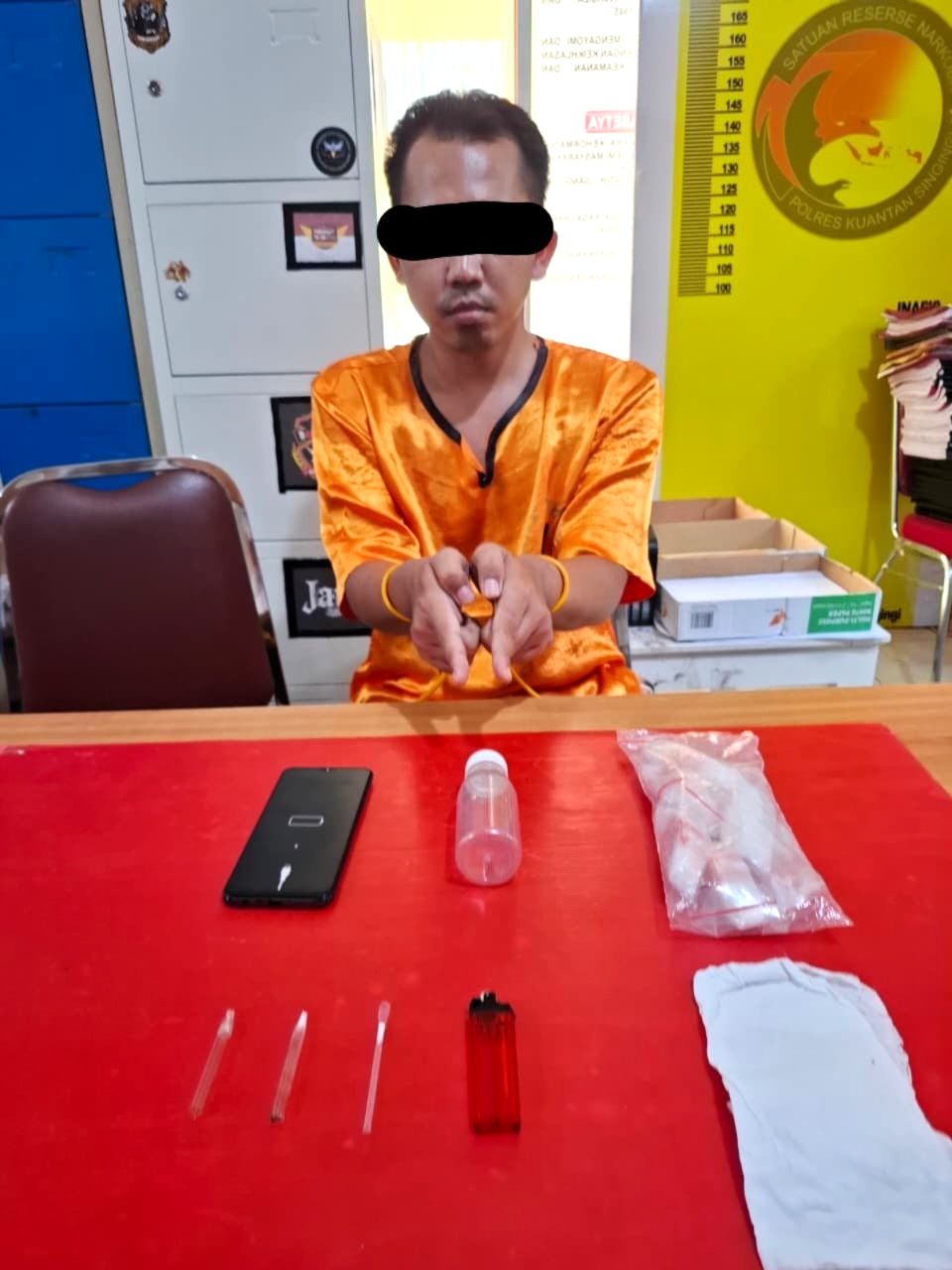 Saat penggerebekan dilakukan, tersangka HAS (27) ditemukan berada di dalam kamar rumah itu. Dalam interogasi awal, tersangka mengakui bahwa ia baru saja mengonsumsi sabu di rumah neneknya yang masih berada di desa yang sama. Tim Elang Kuantan kemudian bergerak ke lokasi tersebut dan menemukan barang bukti berupa pipet kaca berisi sabu, bong, plastik klip bening kosong, serta perlengkapan lain yang diduga digunakan untuk mengemas dan mengonsumsi narkotika.