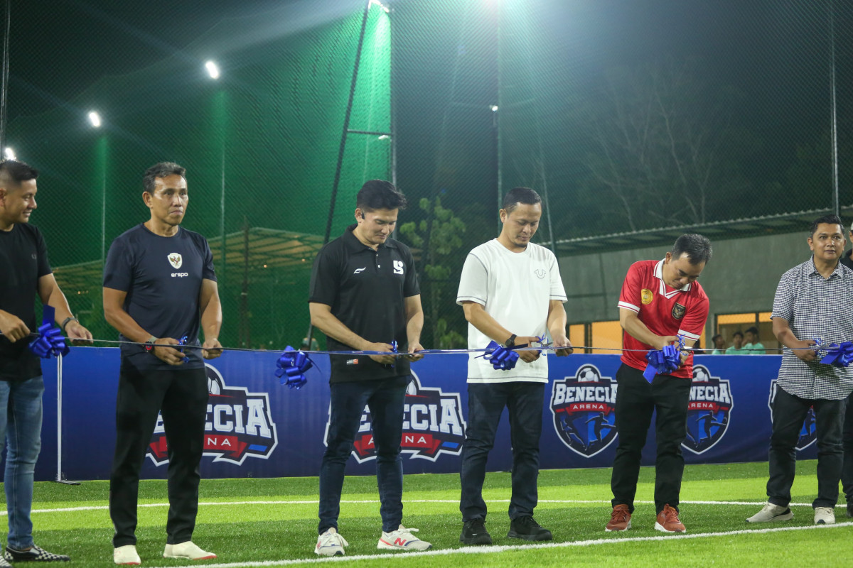 Pengguntingan pita dilanjutkan dengan tendangan bola pertama oleh Walikota Agung menandai soft opening lapangan mini soccer Benecia Arena.